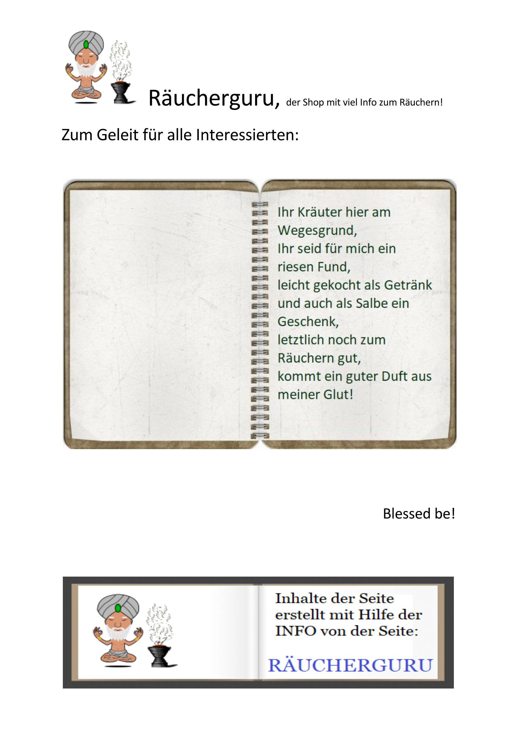 Du kannst und darfst die Bilder speichern, wenn du ein PDF oder PowerPoit von dem Buch haben möchtest, so schreib mit bitte, weil das HomePageProgramm keine Download hat. Damit kann ich dir per E-Mail beides schicken. Bitte bedenke dass bei Veröffentlichung der Räucherguru nicht entfernt werden soll, da es die Seite mit den meisten Inspirationen war.